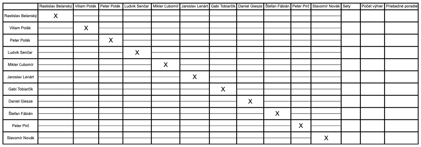 - Hrá sa každý s každým na jeden víťazný zápas na 4 víťazné sety do 11 bodov.